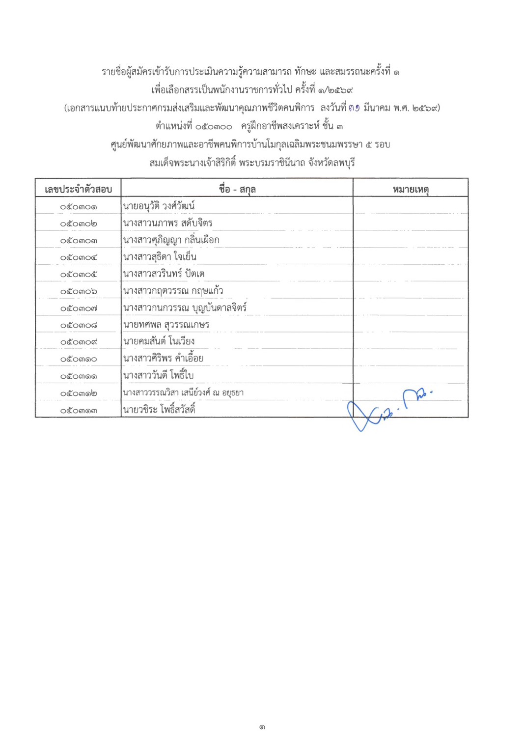 รายชื่อผู้สมัครเข้ารับการประเมินความรู้ความสามารถ ทักษะ และสมรรถนะ ครั้งที่ 1 เพื่อคัดสรรเป็นพนักงานราชการทั่วไป ครั้งที่ 1/2569
